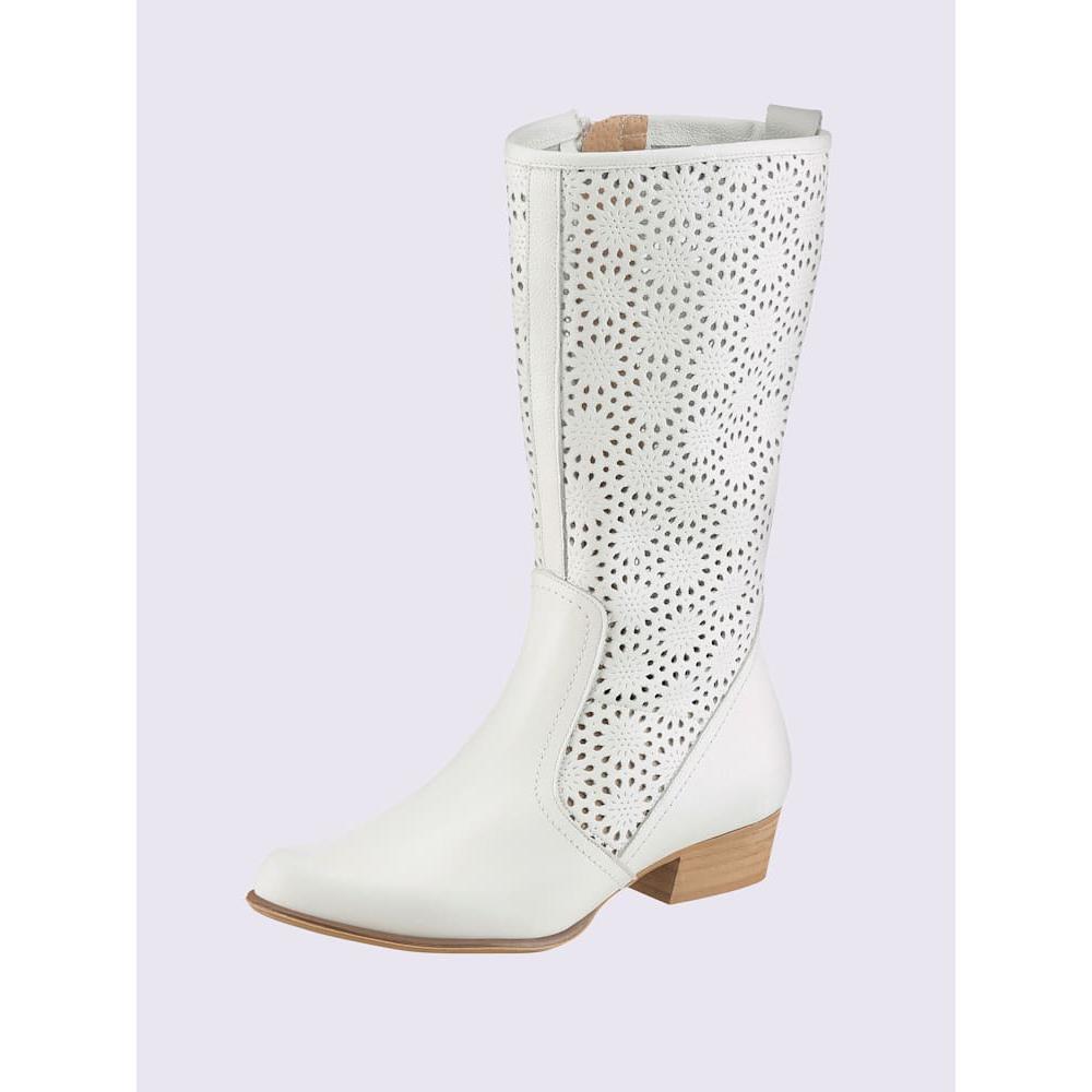 Bottes faites en Espagne. Cuir lisse ou velours vachette doux, avec découpes au motif floral. Glissière. Doublure et semelle intérieure : cuir. H/l tige env. 31×35 cm. Talon bottier env. 30 mm.