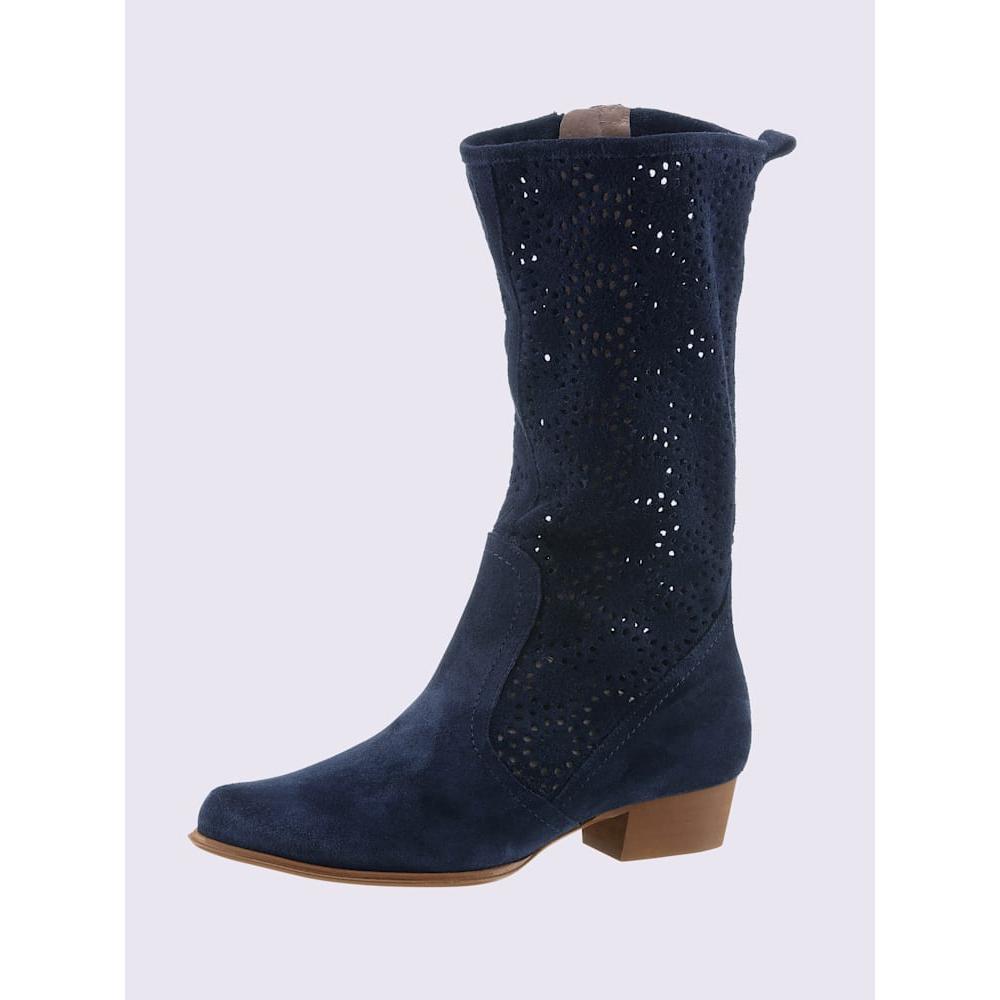 Bottes faites en Espagne. Cuir lisse ou velours vachette doux, avec découpes au motif floral. Glissière. Doublure et semelle intérieure : cuir. H/l tige env. 31×35 cm. Talon bottier env. 30 mm.