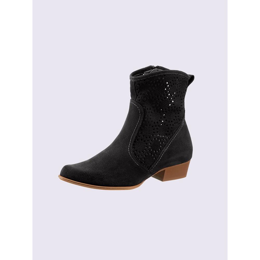 Bottines fabriquées en Espagne. Féminin, joli motif ajouré. Cuir velours de vache doux. Intérieur cuir. Semelle caoutchouc souple. Hauteur tige env. 20 cm. Talon cowboy env. 30 mm.