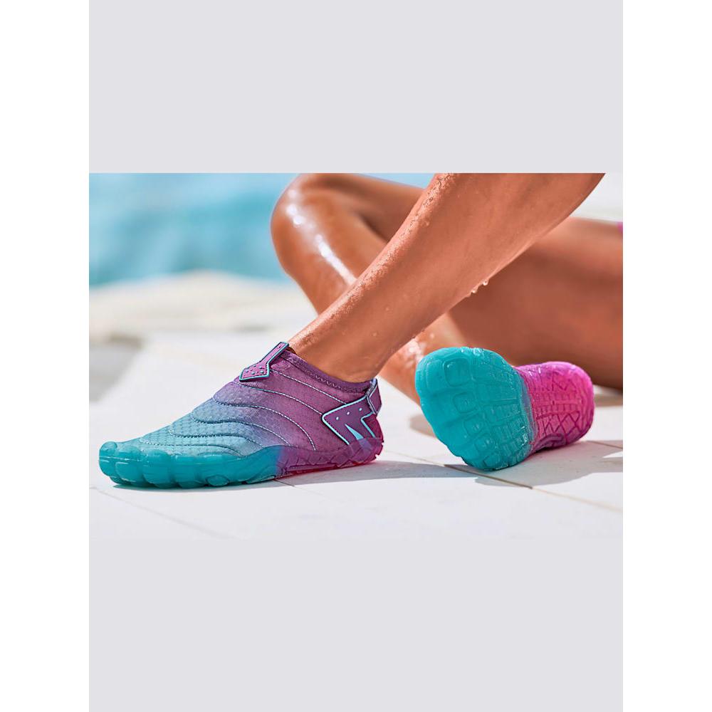 Chaussures de bain respirantes en matière imperméable à séchage rapide avec fermeture auto-agrippante au talon Végan – sans éléments d’origine animale Parfaites en cas d’hallux valgus – ne serrent pas Un compagnon idéal pour les vacances à la plage, pour la piscine ou les sports nautiques comme l’aquabiking et le stand-up paddle – idéal également en tant que chaussures de surf Protège parfaitement contre les irrégularités et les petites pierres sur la plage et dans l’eau.