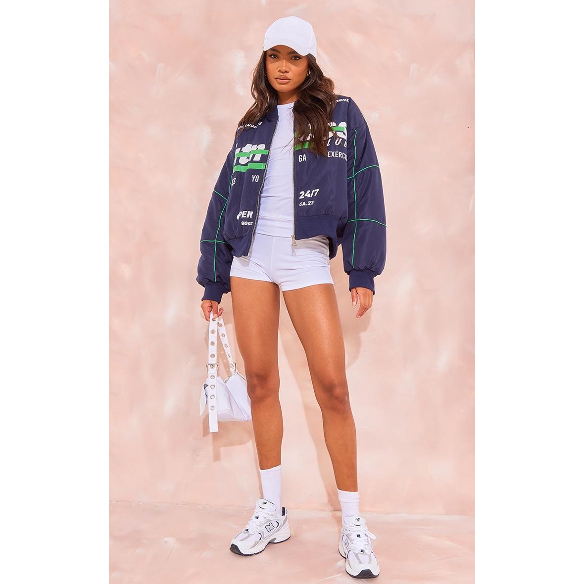 Tall Bomber en nylon bleu marine à imprimé, Bleu Marine. PLT Tall est la collection de PrettyLittleThing pour les filles de plus d’1m75. Fini les robes et les tops trop courts, mettez en valeur votre silhouette avec des vêtements qui vous vont parfaitement !