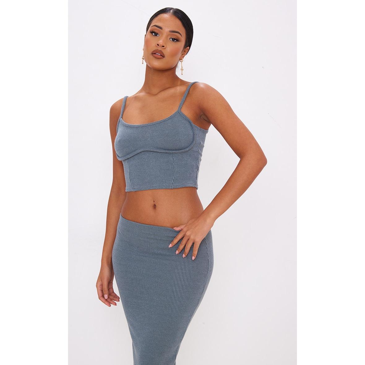 Tall Crop top côtelé gris anthracite à bretelles, Gris anthracite. PLT Tall est la collection de PrettyLittleThing pour les filles de plus d’1m75. Fini les robes et les tops trop courts, mettez en valeur votre silhouette avec des vêtements qui vous vont parfaitement !