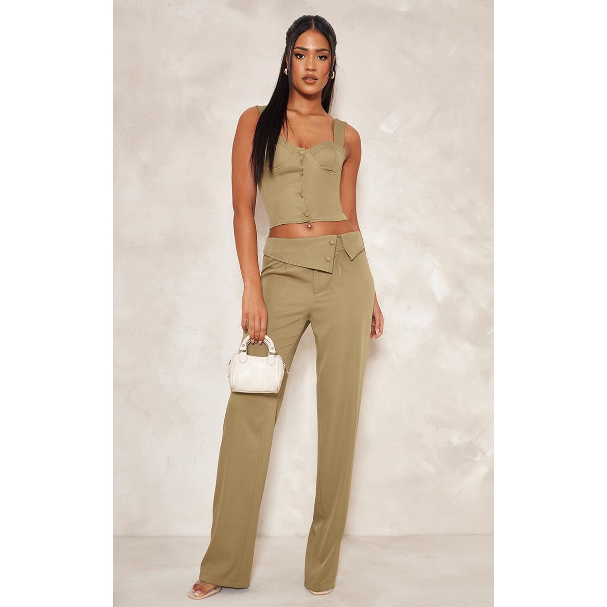 Tall Pantalon large kaki à taille repliée sur le devant, Kaki. PLT Tall est la collection de PrettyLittleThing pour les filles de plus d’1m75. Fini les robes et les tops trop courts, mettez en valeur votre silhouette avec des vêtements qui vous vont parfaitement !