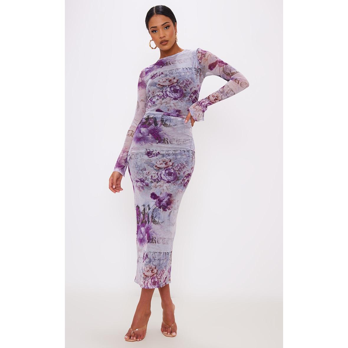 Tall Robe longue froncée lilas à imprimé fleuri, Lilas. PLT Tall est la collection de PrettyLittleThing pour les filles de plus d’1m75. Fini les robes et les tops trop courts, mettez en valeur votre silhouette avec des vêtements qui vous vont parfaitement !