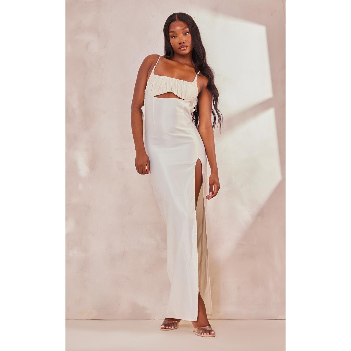 Tall Robe longue satinée crème à devant froncé, Crème. PLT Tall est la collection de PrettyLittleThing pour les filles de plus d’1m75. Fini les robes et les tops trop courts, mettez en valeur votre silhouette avec des vêtements qui vous vont parfaitement !
