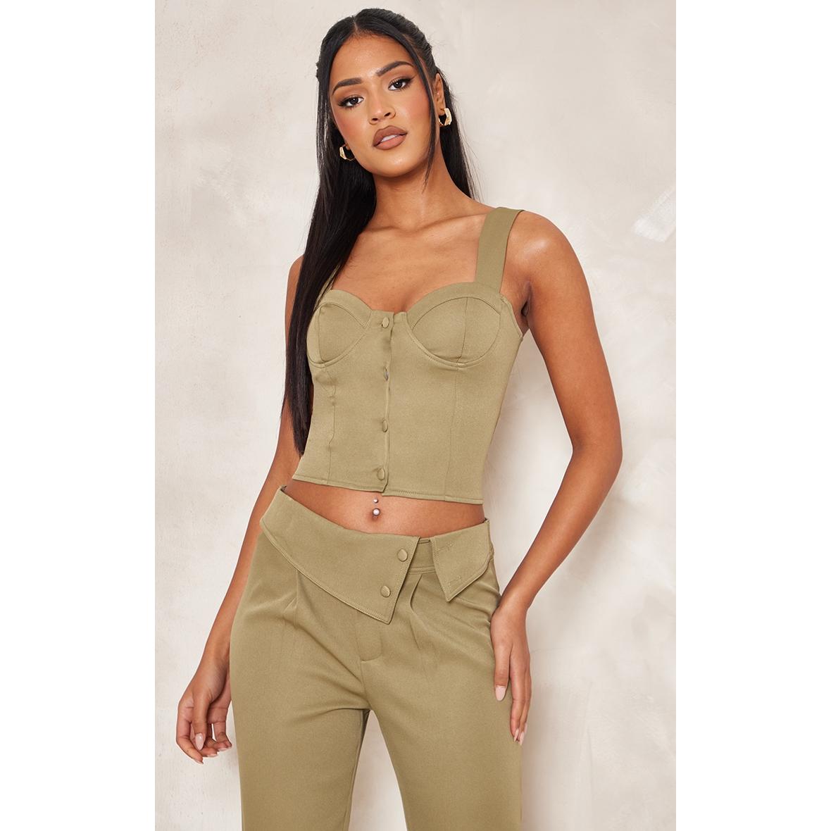 Tall Top corset kaki à boutons, Kaki. PLT Tall est la collection de PrettyLittleThing pour les filles de plus d’1m75. Fini les robes et les tops trop courts, mettez en valeur votre silhouette avec des vêtements qui vous vont parfaitement !