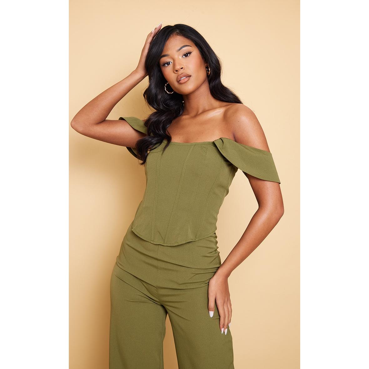 Tall Top corset texturé vert olive à épaules dénudées, Vert Olive. PLT Tall est la collection de PrettyLittleThing pour les filles de plus d’1m75. Fini les robes et les tops trop courts, mettez en valeur votre silhouette avec des vêtements qui vous vont parfaitement !