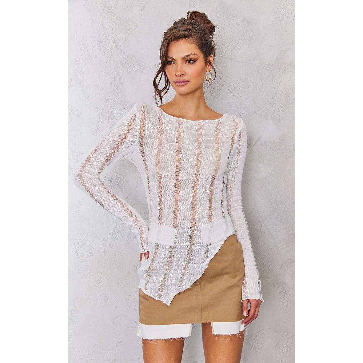 Tall Top manches longues en maille ajourée blanche, Blanc. PLT Tall est la collection de PrettyLittleThing pour les filles de plus d’1m75. Fini les robes et les tops trop courts, mettez en valeur votre silhouette avec des vêtements qui vous vont parfaitement !
