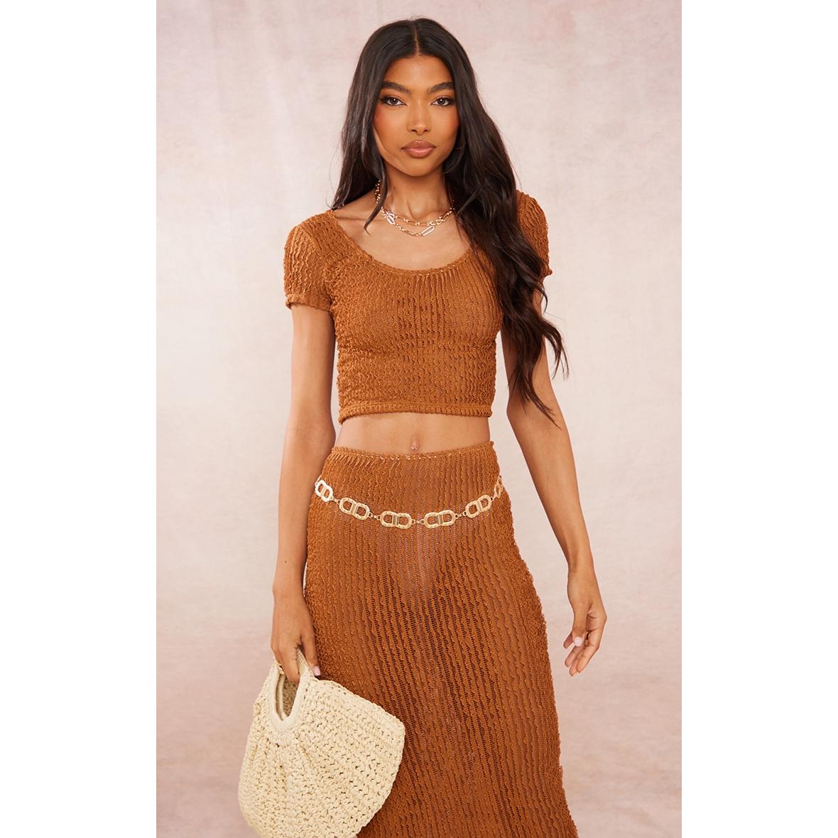 Tall Top texturé marron à dos arrondi, Marron. PLT Tall est la collection de PrettyLittleThing pour les filles de plus d’1m75. Fini les robes et les tops trop courts, mettez en valeur votre silhouette avec des vêtements qui vous vont parfaitement !
